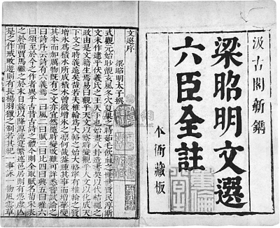 《昭明文选》又称《文选》,是中国现存的最早一部诗文总集,由南朝梁武帝的长子萧统组织文人共同编选。萧统死后谥“昭明”,所以他主编的这部文选称作《昭明文选》。一般认为,《昭明文选》编成于梁武帝普通七年(526) 至中大通三年(531) 之间。