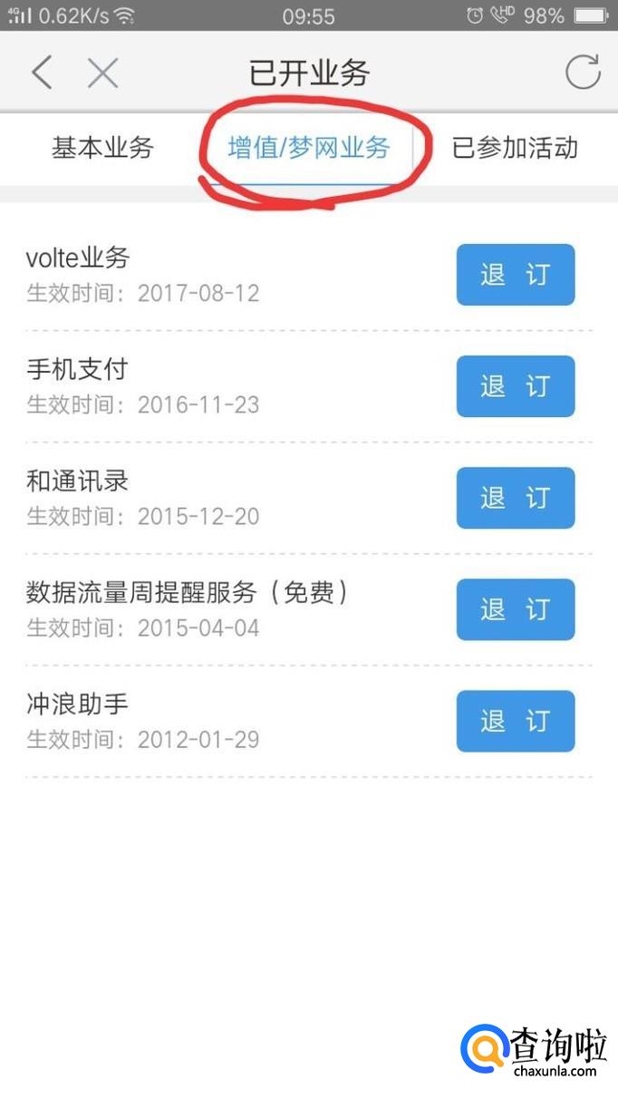 点击“增值/梦网业务”,找到和留言,点击退订,之后就会收到退订成功的消息,这样就退订成功了。