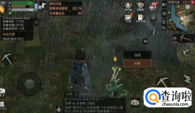 “油菜”就是蔬菜的一种,如下图所示,在秋天森林这个地图中,只有油菜这一种蔬菜哦,远星城里面会有胡萝卜、南瓜这些蔬菜,玩家们可以根据自己的需要去采摘。