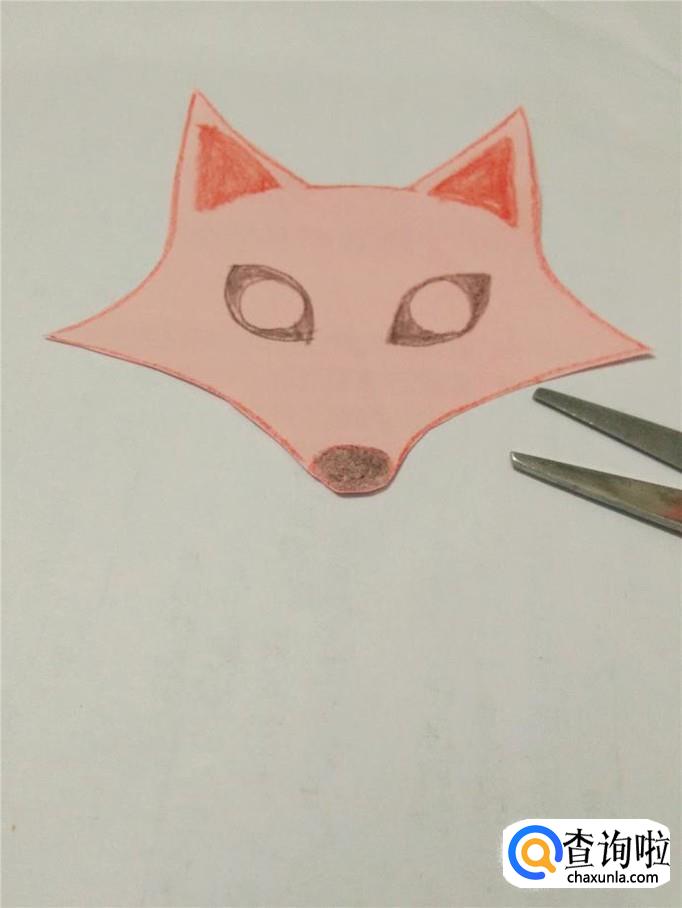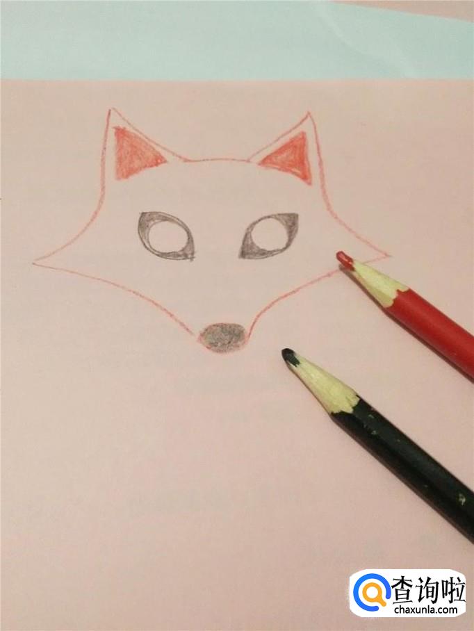 用红笔把狐狸的耳朵涂上红色,用黑笔把眼睛除眼珠外,涂上黑色,最下面的鼻子也涂上黑色。