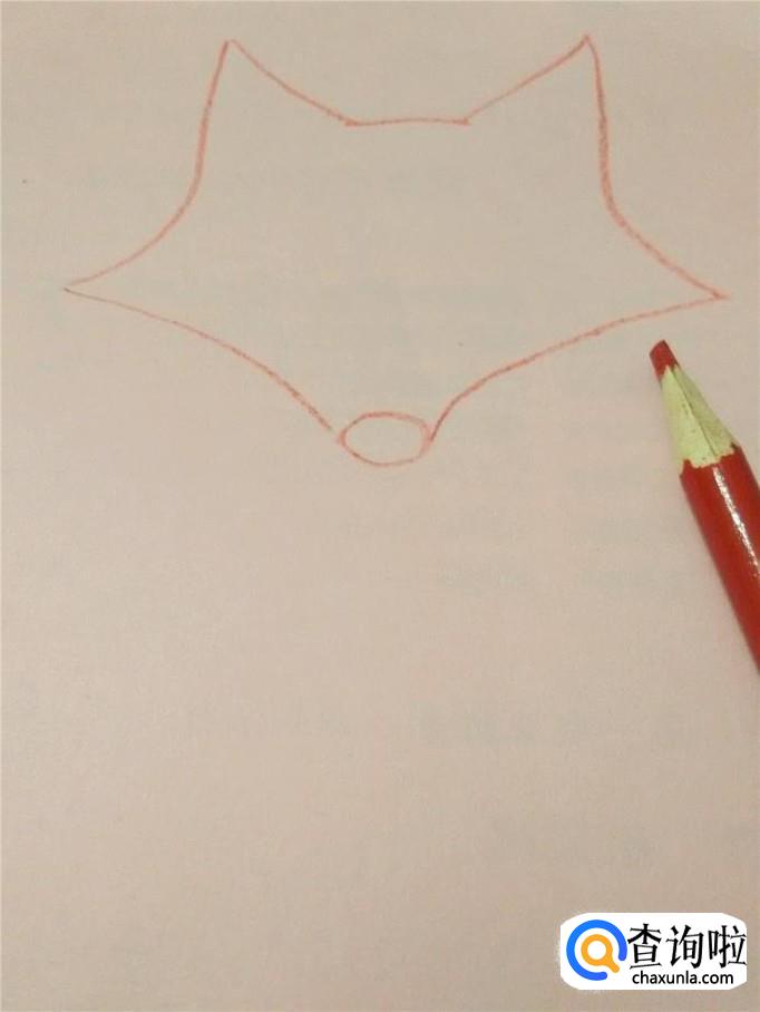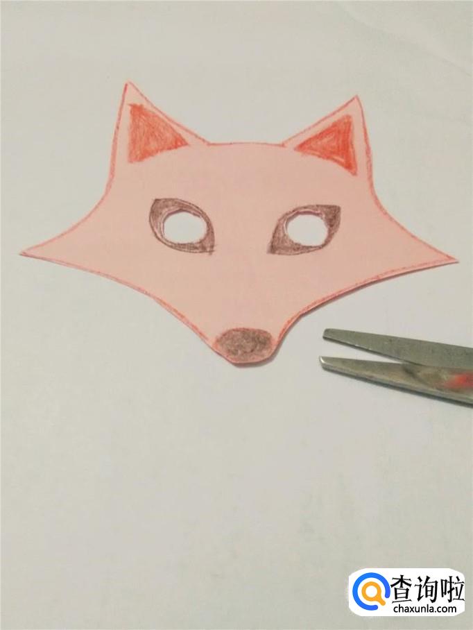 用红笔在彩纸上画出狐狸的头部轮廓,面具大小要和自己的脸差不多大,脸部两侧要画得尖尖的,嘴也要画得尖尖的。