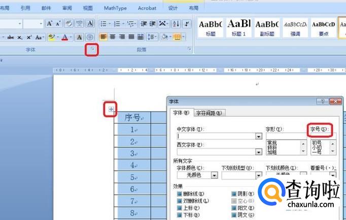我们点击表格左上角符号,全选表格,然后调出“字体”选项框,对表格中字体进行字号变小设置。