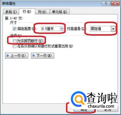 点击选项框中的“行”标签,进行每行高度设置,选一个较小的高度,并设置行高为“固定值”,把“允许跨页断行”前面的对勾去掉,点击“确定”。