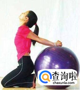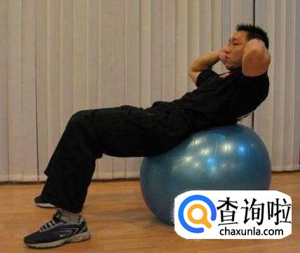 平躺在健身球上,双脚平放地上,双手放在头侧,手臂打开。下颏向胸前微收,呼气,收缩腹肌抬起上身约45度,保持2秒钟,然后慢慢回到开始姿势。为了保持平衡,两脚可以多分开些。如果增加难度,可以将双脚并起来做。
