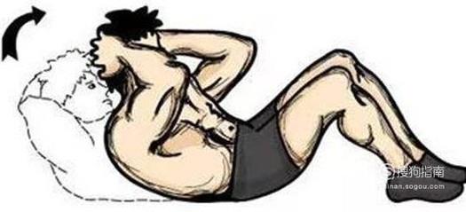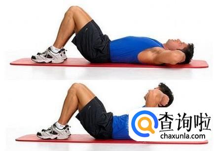 仰卧在地板上,下背部紧贴地面。双手放在头侧,手臂打开。双腿抬起与上身呈90度,双腿交叉,膝关节微屈。呼气,收缩腹肌,抬起上身,下背部不能离地,保持2秒钟,然后慢慢回到开始姿势。要注意保持下颏向胸前微收。