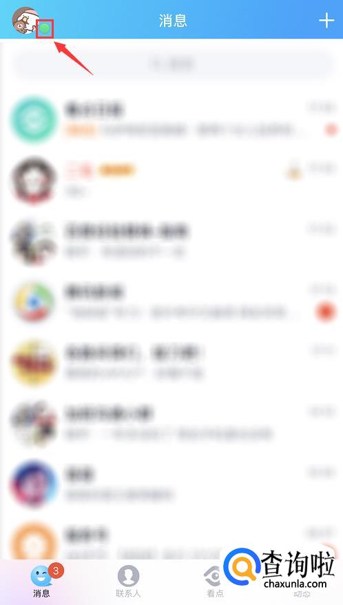 打开手机QQ,进入消息列表页面,点击左上角头像图标旁边的小绿点。