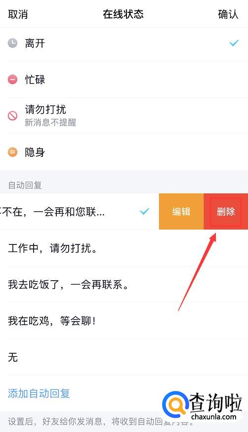 选择后,进入在线状态页面,在这里我们可以看到我们设置的自动回复,选择你想要删除的自动回复,用手指从右向左滑动,该条自动回复后面将会出现“编辑”和“删除”两个选项,点击【删除】。