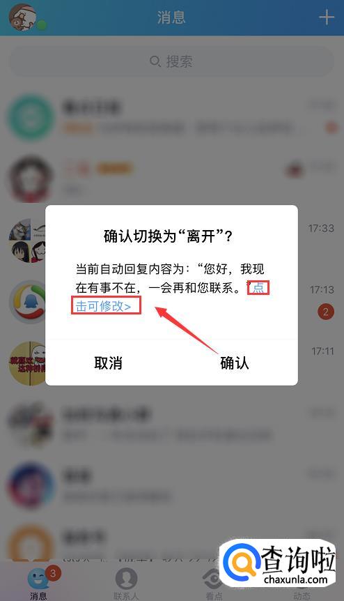 接着,页面会弹出一个提示框,询问你是否将状态切换成“离开”,点击文字中的蓝色部分【点击可修改】。