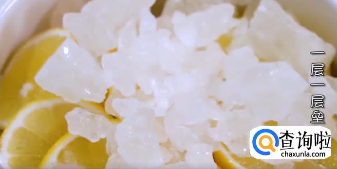 接着,将切好的柠檬片码在锅底,上面一层放上陈皮和冰糖,再覆盖一层柠檬片,再加冰糖,用勺子将其压平。