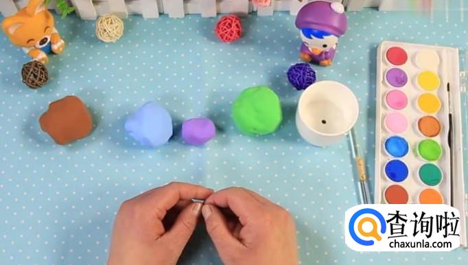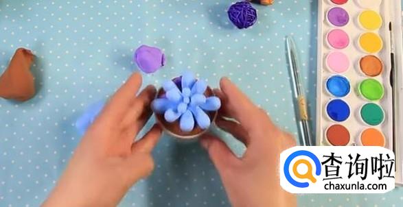 提前放置一段时间的正在硬化的黏土团,褐色、蓝色、紫色三种颜色的超亲黏土,小塑料盆,水粉颜料,画笔