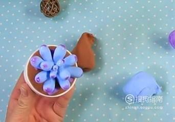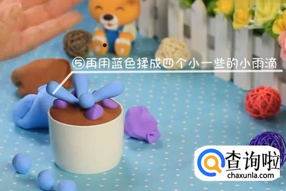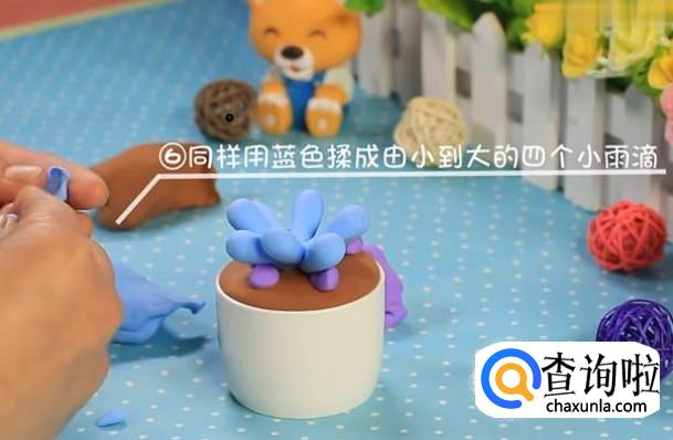 取蓝色黏土捏成四个大小相同的雨滴状,如图插在小盆栽中间。