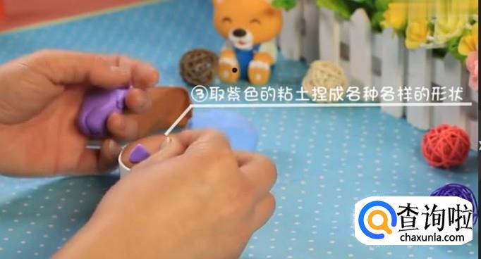 取紫色的黏土捏成各种各样的形状,放在小盆边缘!