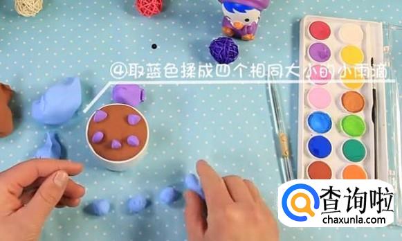 再用蓝色黏土捏成稍微小一点的四个同样的雨滴。插空放在四个大雨滴中间,注意在正中间要留出空间。