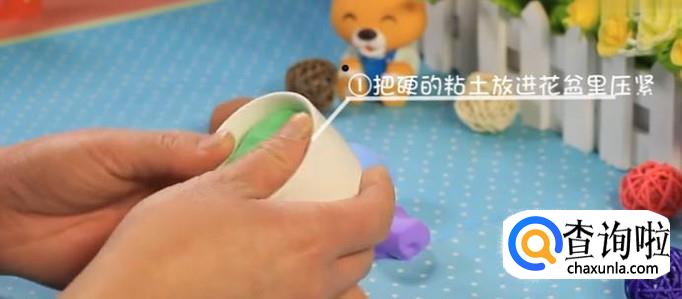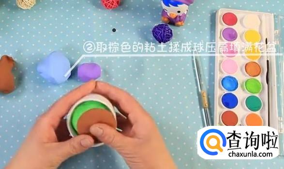取棕色(泥土色)黏土,揉成球压扁填满花盆。