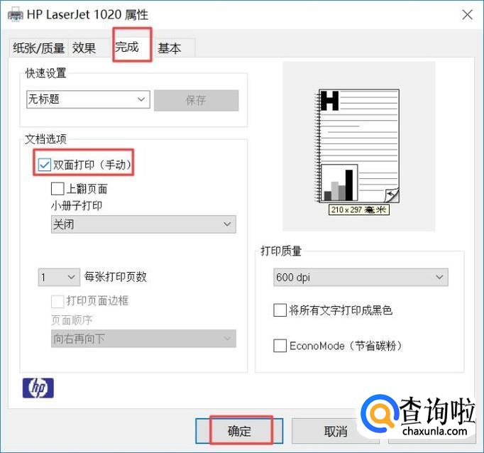 弹出的界面,我们点击完成,然后将双面打印给勾选上,之后点击确定;