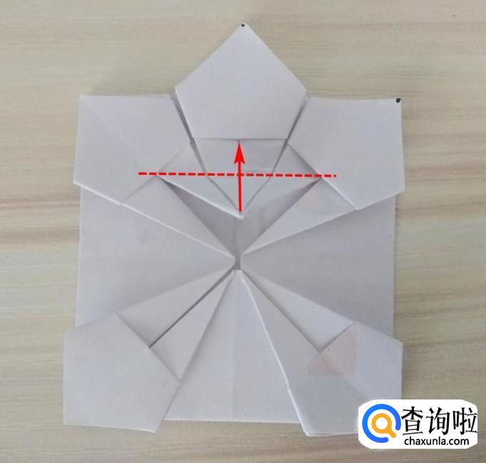 捏着中间的角沿着虚线向上折,尖角插到上面的缝隙中,剩下的三块做同样的操作,折好以后整体呈规整的八角花;