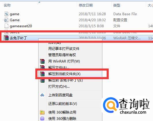从桌面上将去兔子补丁拖进来右键点“解压到当前文件夹”。