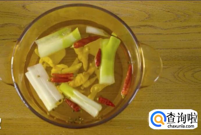 锅中加入纯净水、大葱、姜片、料酒、盐一匙半、花椒、泡椒、干辣椒。
