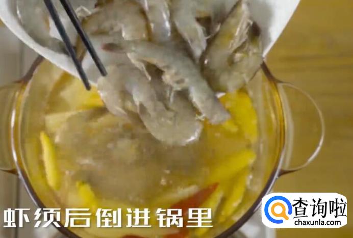 煮开后加入花生油、胡椒粉、处理过的虾。