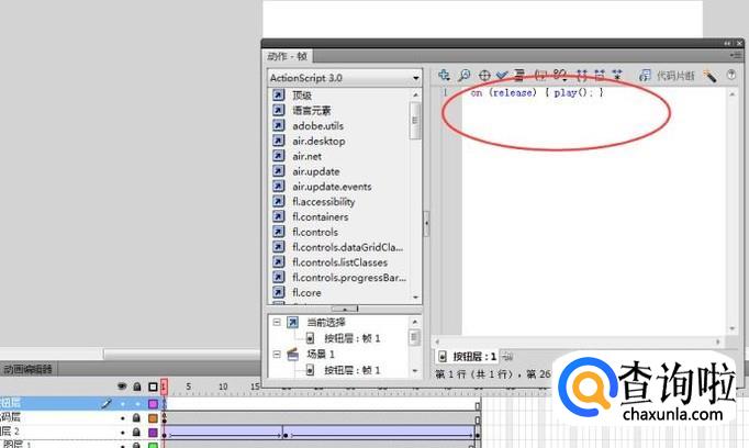 接下来输入按钮的代码,创建图层4,然后点击F9输入代码on (release) { play(); } ,如下图所示: