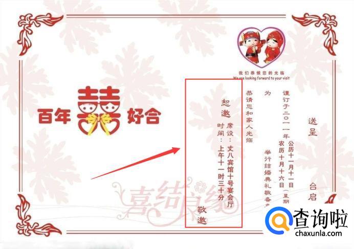 最后写上开始宴请大家的地点以及宴席开始的时间。
