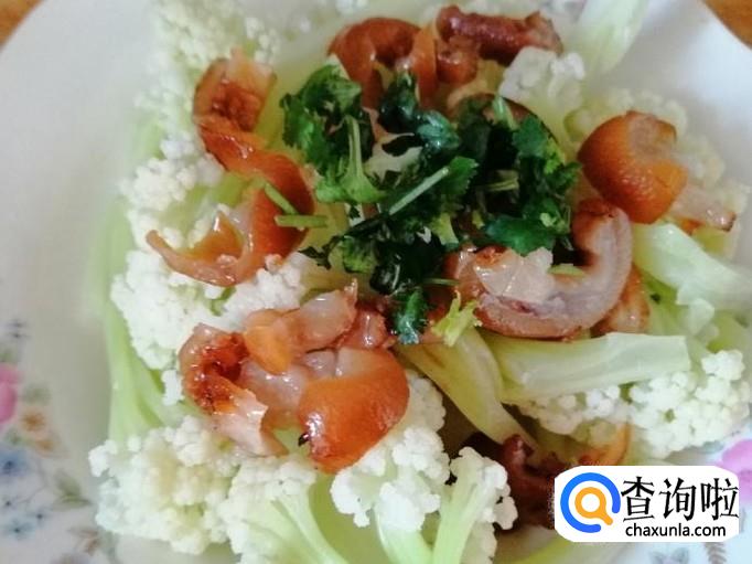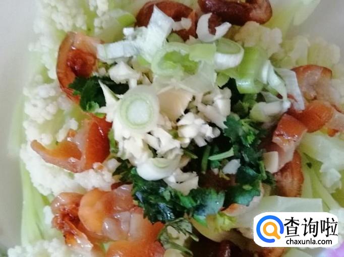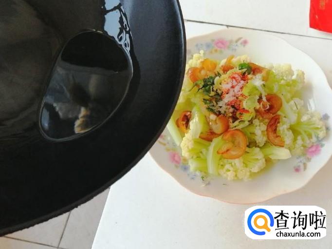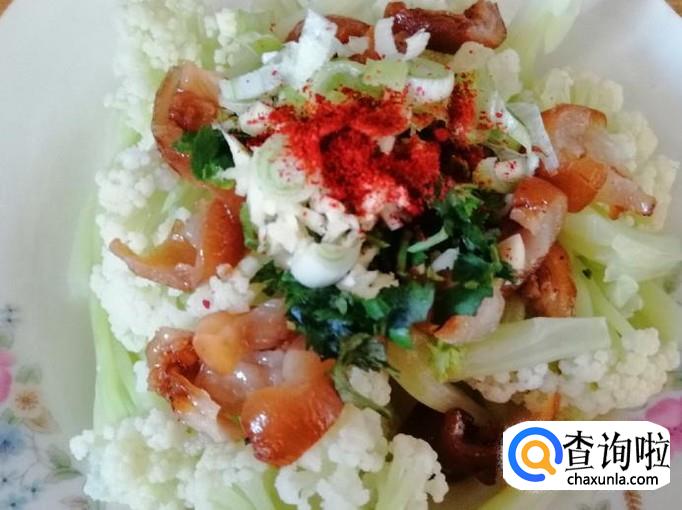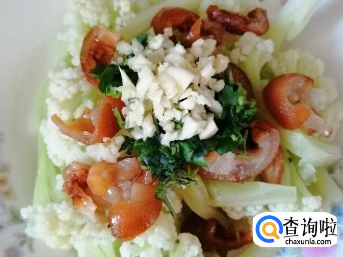 烫熟的菜花入盘,放入切好的猪蹄筋,放入香菜和备好的蒜末,所有食材量根据自身喜好来决定放多少。
