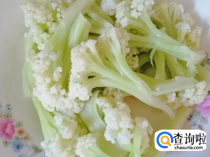 把切好的菜花放入菜筐控水,煮锅放水,水烧开后放入备好的菜花烫三分钟左右关火,尝一下熟了就可以,如果不熟就盖着锅盖再焖两三分钟,菜花熟了捞出备用。