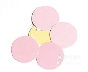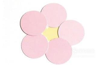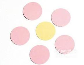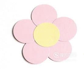 然后将粉色的圆形卡纸粘贴在黄色的圆形卡纸上,值得注意的是,一个黄色的圆形卡纸上需要粘贴五个粉色的圆形卡纸。