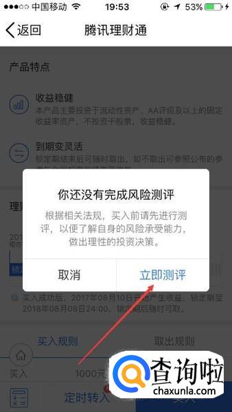 如果我们不知道自己的抗风险能力,并且位完成风险测评,此时页面会弹出测评风险对话框,点击对话框中的“立即测评”按键。