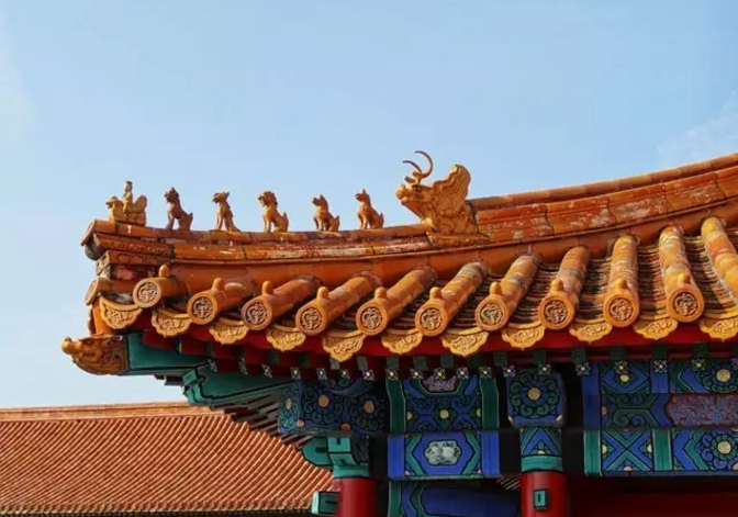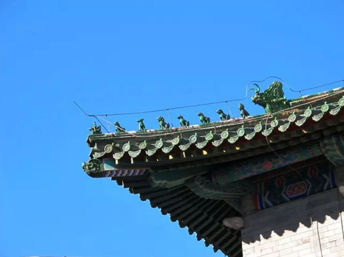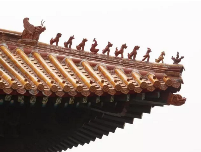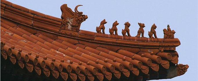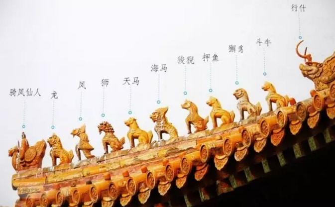 古建屋顶的檐角通常要装饰不同数量的神兽。唐宋时期,只有一枚脊兽,以后逐渐增加了数目不等的蹲兽,到了清代形成了今天常见的“仙人骑凤”领头的小动物队列形态。檐角最外侧的是一个骑着凤的小人,俗称“仙人骑凤”,其后是一排小神兽,俗称走兽,走兽后面是一个较大的兽头,叫做垂兽。一前一后的仙人骑凤和垂兽是固定的,走兽放置的数量,根据脊的长短和建筑的等级而定。