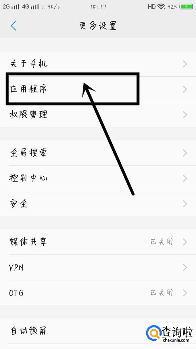 在“更多设置”页面,点击“应用程序”,进入下一页面,如图所示。