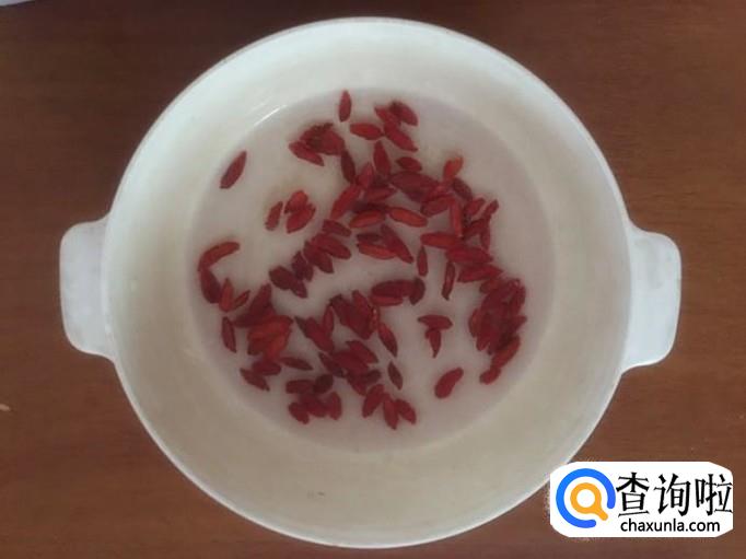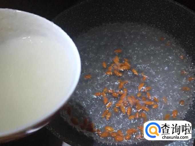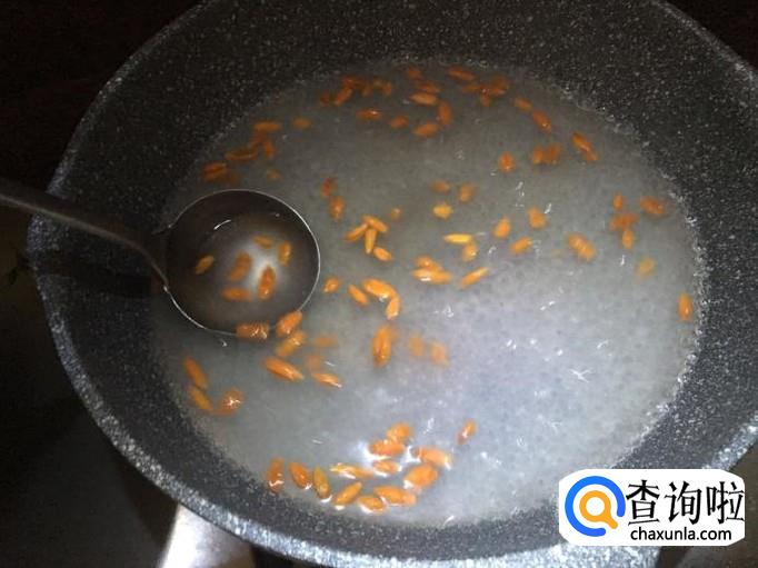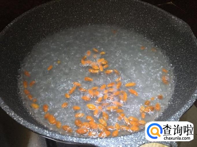 锅中倒入适量的水,大概30克粉配1000G水,水开倒入枸杞稍微煮一会,倒入兑水的凉粉糊