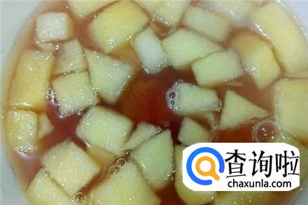 选择红苹果去皮去核切成块,加清水和冰糖煮开,小火慢慢熬至汤汁渐浓,有着助消化以及美白皮肤的功效。