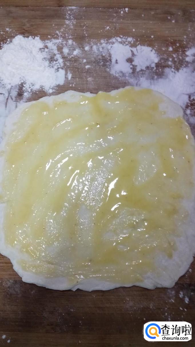 将醒好的面团,分成小剂子,擀成片儿,均匀的抹上一层油酥。