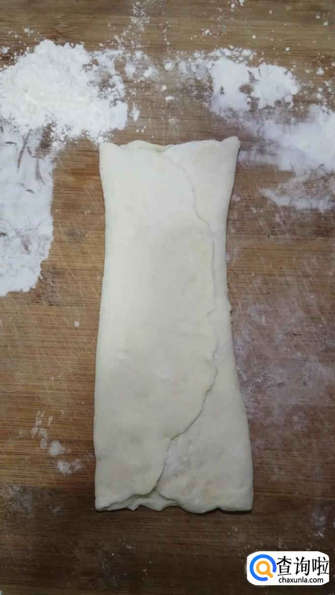 左右向中间折一下,前后再向中间折一下,封好口,做成一个口袋,再用擀面杖擀开。