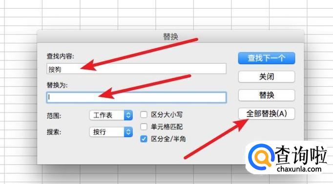 在第一个输入框里输入‘搜狗’,第二个输入框不需要输入任何内容,点击‘全部替换’按钮就行了。