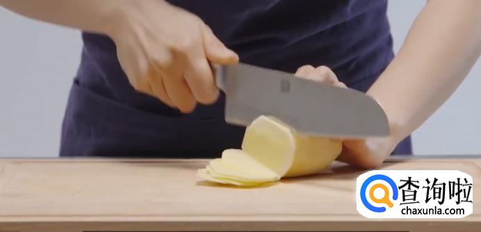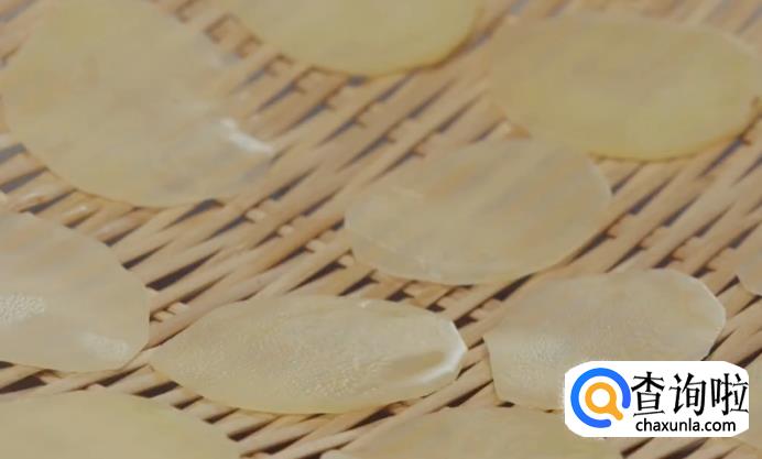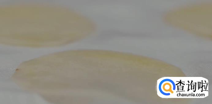 首先将一毫米厚的土豆片,放入冷水之中,去除多余的淀粉,接下来用干净的棉布,将土豆片表面的水分吸干,这样可以减少烤制时间。