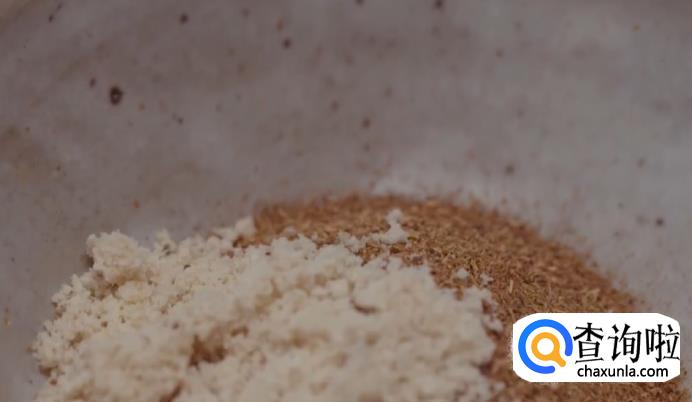 接着将辣椒面、花椒面和熟的白芝麻粉,按照2:2:1的比例,混合均匀。