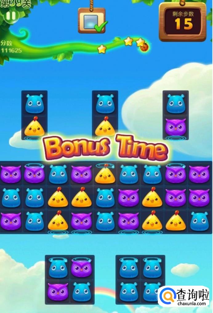 四星过关的关键就是要形成魔力鸟特效,如果魔力鸟有了的话,任务很快就会完成,这个时候我们如果想达到4星的话,就要加上其他的一些特效,比如说魔力鸟和爆炸特效,如果形成这种叠加的特效,我们就可以达到120000分,并且一次性通过39关。