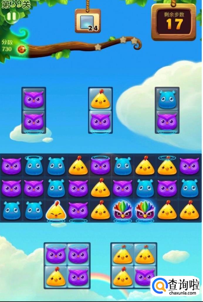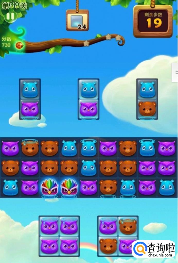 本关的任务就是在20步之内将上下所有的冰块全部都消除掉,因为冰块只有两个,无法形成三个动物同时消除的技能,所以我们需要形成魔力鸟和垂直的特效来进行消除。