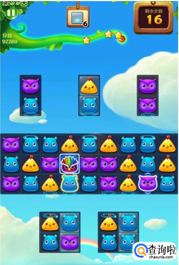 如果想要拿到四星过关的话,我们需要尽可能多的形成魔力鸟的特效,如图所示,将魔力鸟和魔力鸟之间进行交换,你就可以达到三颗星,如果你整个关卡只用了垂直特效而没有用魔力鸟特效的话,是不可能四星过关的。