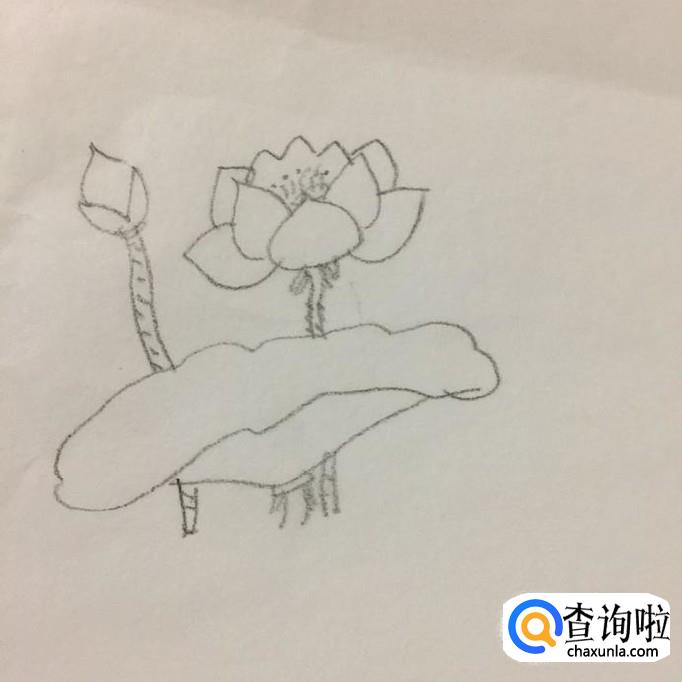 接着画出一朵含苞待放的荷花,如下图所示。画这部分的时候注意这朵荷花要画的尖尖的会比较好,另外还要注意的是要在荷花的杆上画出一些刺。
