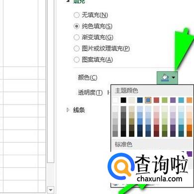 点选“纯色填充”后,在下面展开了“颜色”和“透明度”这两项;鼠标点击“颜色”右侧的颜色下拉按钮,在弹出的颜色面板中,选择:蓝色