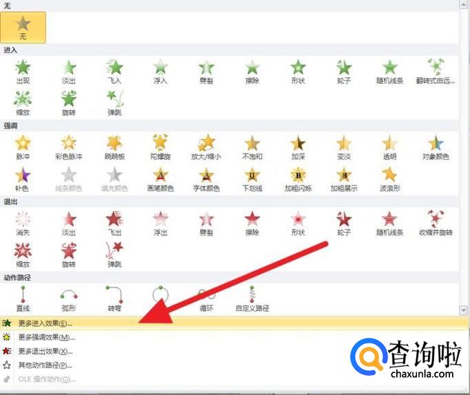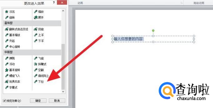 然后再点击动画效果中的更多进入效果。最后在选择下拉动画效果就可以实现文字的足字显示了。