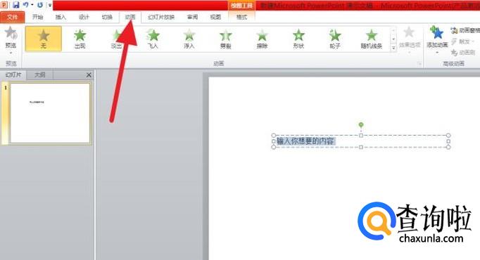 接着输入你想要的内容。然后全部选中内容,再点击顶部菜单栏中的动画。如图。