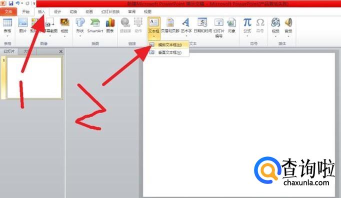然后在顶部的菜单栏中选择插入。其次再选择文本框、横排文本框。如图。
