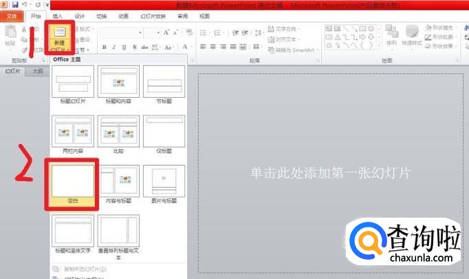 打开新建的PPT。然后点击新建幻灯片,再点击空白页。如图。