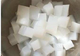 将外面买回家的凉粉切块备用,因为自己做太麻烦,所以我直接在外面买的。
