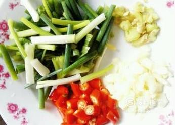 准备配料,将大蒜和姜切片,葱,辣椒切段备用。