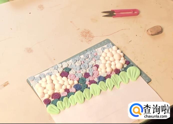 我们先准备一张硬纸,在纸上用铅笔轻轻画出图形的大概轮廓。然后我们开始做云朵,用大小不一样的圆球,拼接在一起,就成了一朵一朵的云朵。